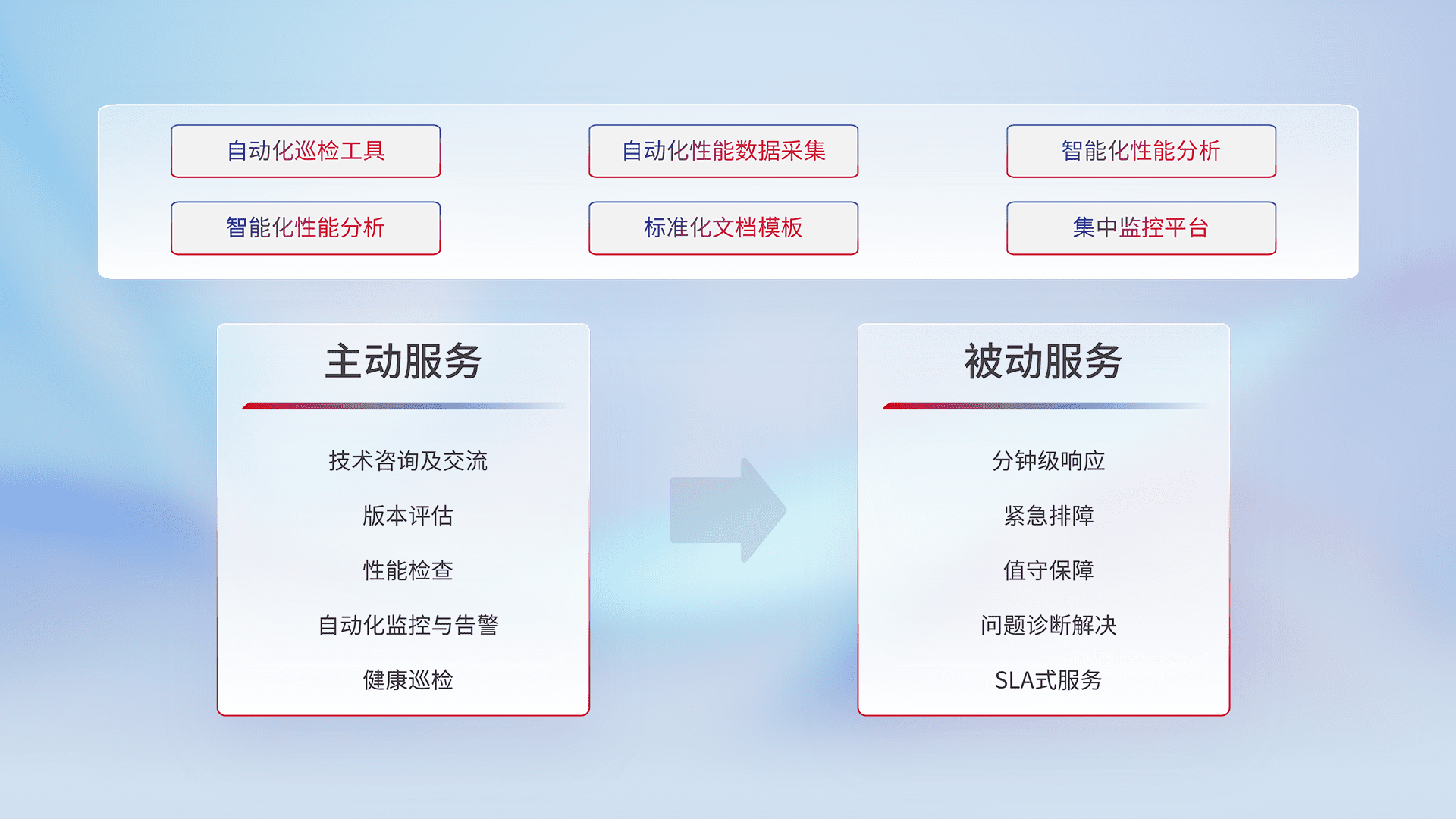 智能化工具和标准化文档,,保障服务质量,,,,提供主动服务(包含技术咨询、、版本评估、、、性能检查、、自动化监控与告警、、、健康巡检)和被动服务包含(分钟级响应、、、、紧急排障、、、、值守保障、、、、问题诊断解决、、、、SLA服务)。。