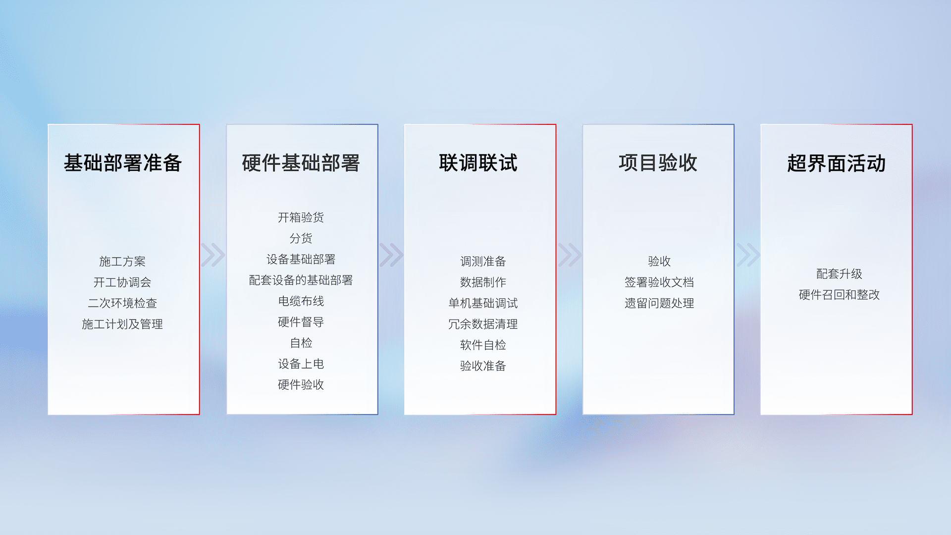 从基础部署准备、、、硬件基础部署、、、联调联试、、项目验收、、、越界面活动的全过程可追溯,,,保证施工质量和进度。。。。